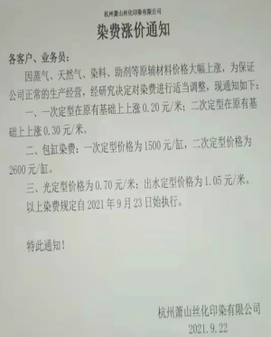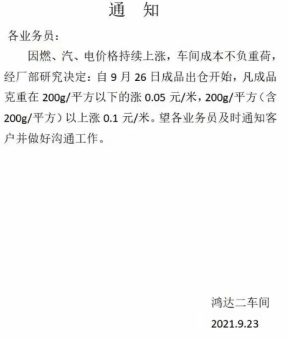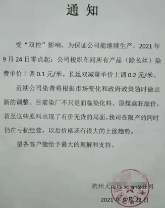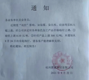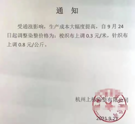 首当其冲的印染产业,迫于无奈,印染厂或将进行染费价格调整来缓解各项生产成本压力。9月下旬,涉及吴江、绍兴、普宁、常熟、桐乡等多家印染厂紧急调整染整加工费来应对不断上涨的成本,分别涉及到针织面料、梭织面料系列。